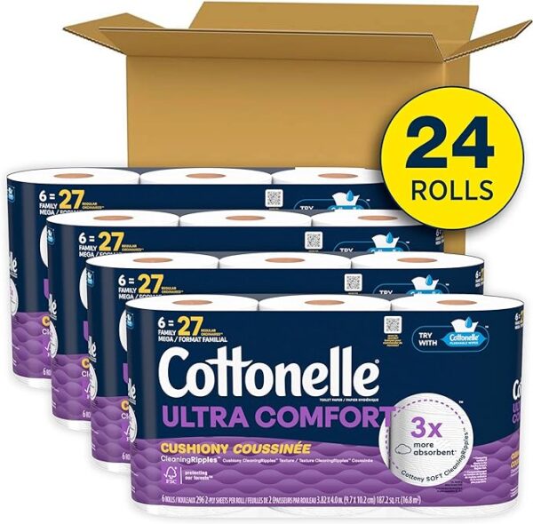 Cottonelle Ultra Comfort Toilet Paper with Cushiony CleaningRipples Texture, Strong Bath Tissue, 24 Family Mega Rolls = 108 Regular Rolls (4 Packs of 6)