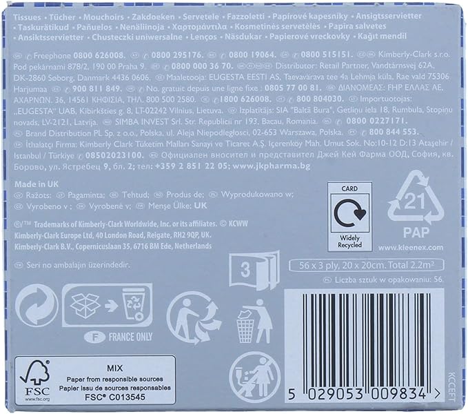 Kleenex Everyday Tissues offer soft, reliable comfort in three stylish designs (varies) to match any home. Made by Kimberly-Clark (creators of Andrex & Huggies), these tissues balance gentleness and quality for daily use.